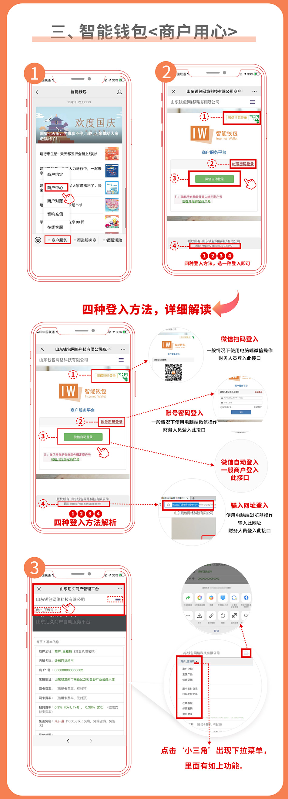 智能钱包对账平台分为电脑端和公众平台两种登录方式, ,,使用条码付直联商户号登录。。。