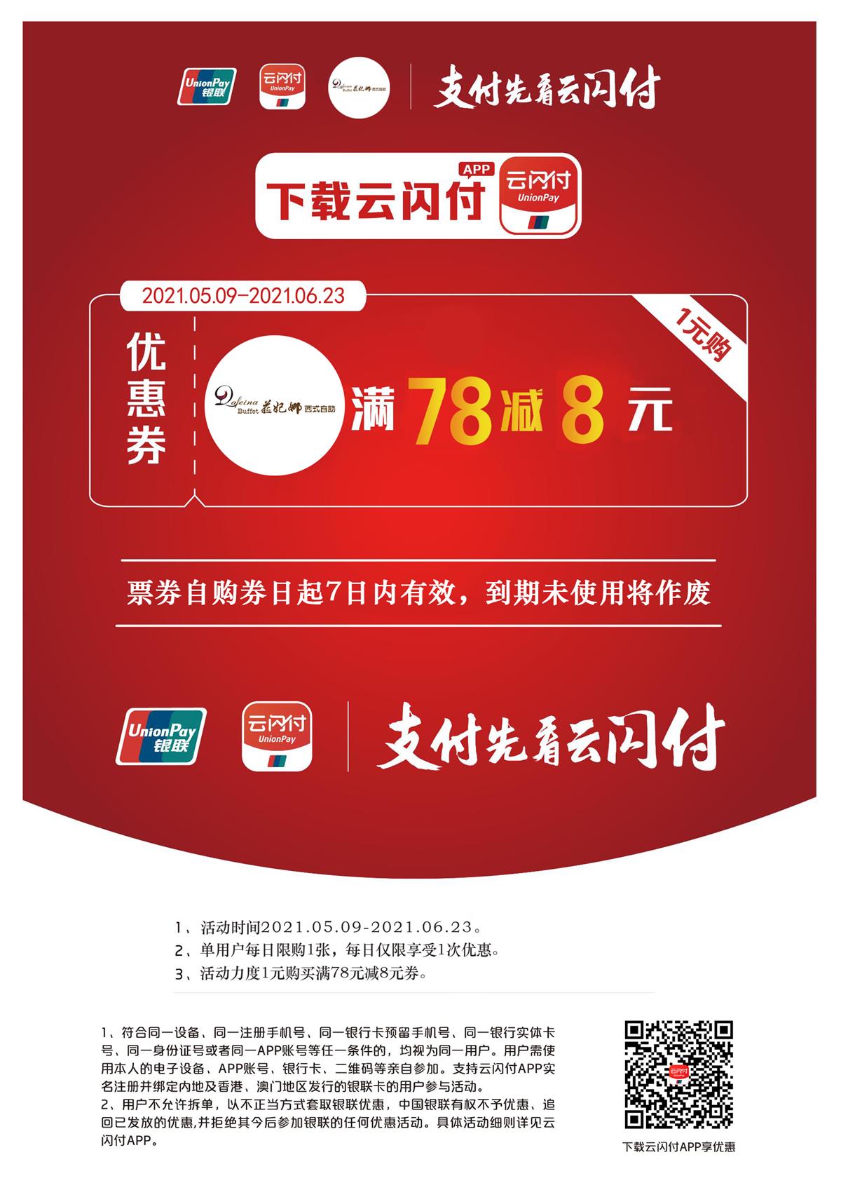 - 云闪付活动——菈妃娜西餐自助满78减805-13